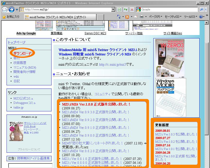 ここでは、Windows用のmixi、GMail、Twitterや2ch、auone他のクライアントである、 MZ4のダウンロードとインストールの方法を解説します。Windows Mobile用であるMZ3.iについては、目次よりどうぞ。