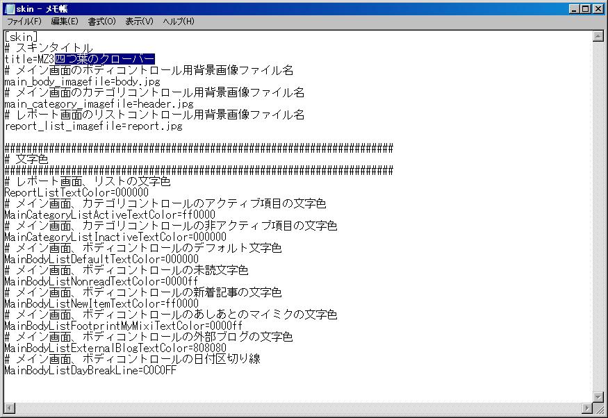 four-leaf_clover内のskin.iniファイルを開きます。ここではメモ帳で。